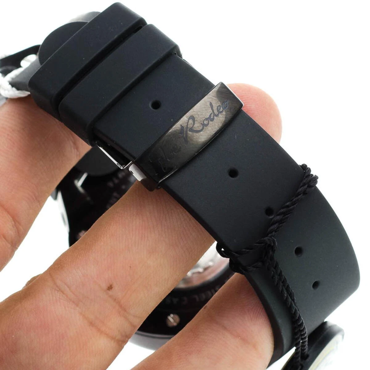 Trendy Black Diamond Watches: This Joe Rodeo Master Diamond Watch features 2.65 carats of black diamonds masterfully set on the bezel and white diamonds on the lugs of the black tone stainless steel case. This Joe Rodeo diamond watch showcases a black mother of pearl dial with three chronograph subdials, a date window at the 4 o’clock position and a black rubber band. This watch comes with two interchangeable rubber bands in different colors. The patented strap adjusts once for a perfect fit, and comes on and off with the press of a button.