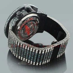 This completely Custom Breitling Super Avenger Men’s Diamond Watch features 55.70 carats of sparkling white and blue diamonds on the bezel, blue diamonds on the lugs and the sides of the black tone stainless steel case; and the black tone stainless steel band fully paved in blue and white diamonds. This Breitling diamond watch showcases a blue mother of pearl dial with three chronograph subdials, a date display window at the 3 o’clock position, and 2 rows of glistening white stones around it. The case is water-resistant to 100m (330 ft). Please note that diamonds are custom set in this watch and the watch can be further customized with a different face or different color or size diamonds.
