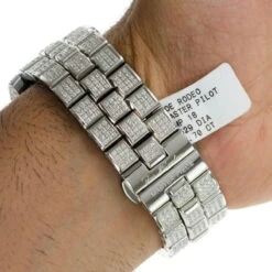 Iced Out Watches: This Men’s Joe Rodeo Diamond Watch Master Pilot features 26.70 carats of sparkling white diamonds on the bezel, white diamonds on the sides and lugs of the silver tone stainless steel case and band. This exquisite Joe Rodeo diamond watch showcases a blue mother of pearl dial with three chronograph subdials paved in sparkling white diamonds, a date display window at the 4 o’clock position, all protected by a scratch-free crystal glass. This luxurious men’s diamond watch by Joe Rodeo is equipped with a super accurate Swiss-made chronograph quartz movement. The case is water-resistant to 100m (330 ft).