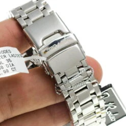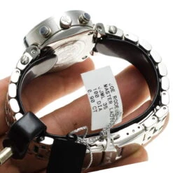 Joe Rodeo Diamond Watches: This 0.90-carat Master Ladies Diamond Watch by Joe Rodeo features an individually numbered and engraved stainless steel case-back, a genuine diamond bezel,a polished silver tone stainless steel case, a black mother of pearl dial with three chronograph subdials, a date display window at the 4 o’clock position, and a row of white stones around it. This Joe Rodeo diamond watch is water-resistant to 50 meters and comes with two interchangeable straps in different colors. The patented strap adjusts once for a perfect fit, and comes on and off with the press of a button.