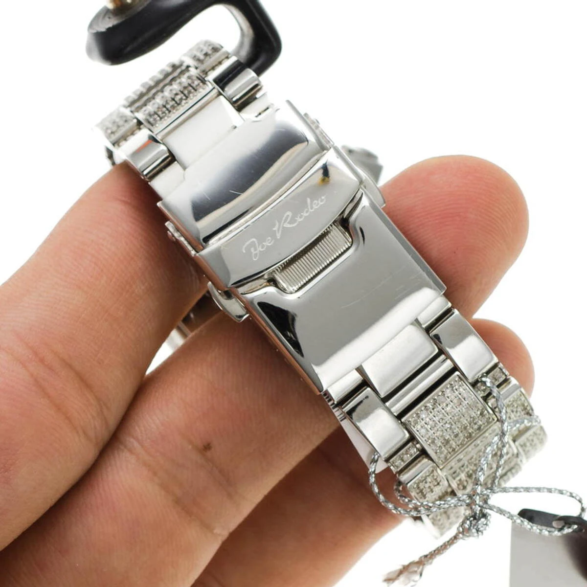 Fabulous Joe Rodeo Watches! This Joe Rodeo Madison Diamond Watch is paved in 10.25 carats of genuine diamonds, each masterfully set around the bezel, on the sides of the silver tone stainless steel case, lugs and the band. The black mother of pearl face features three chronograph subdials and a date display at 4 o’clock. This luxurious Joe Rodeo diamond watch is conveniently water resistant and comes with 2 extra watch bands in different colors.