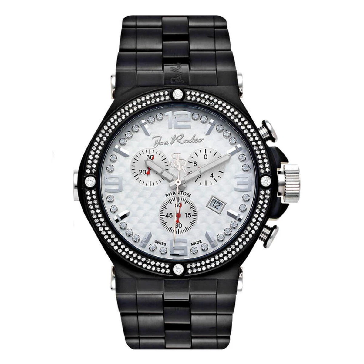 This Joe Rodeo Men’s Diamond Watch (Phantom Black) features 2.25 carats of round diamonds, a black stainless steel case, scratch-free crystal glass and black stainless steel band. This men’s diamond watch has two rows of white sparkling diamonds around the bezel with big diamonds at 3, 6, 9 and 12 hour markers. This watch also features white dial with Silver tone hour markers and a row of sparkling white stones around it. Super accurate Swiss-made quartz movement with chronograph function will keep the time for you. Water-resistant 100m (330 ft).