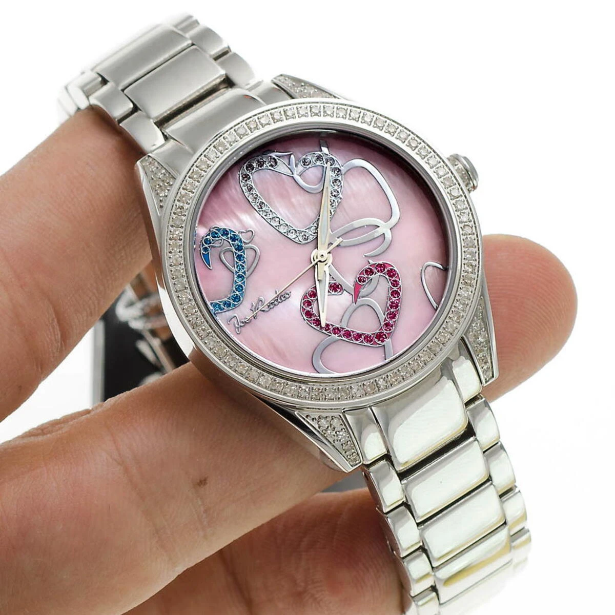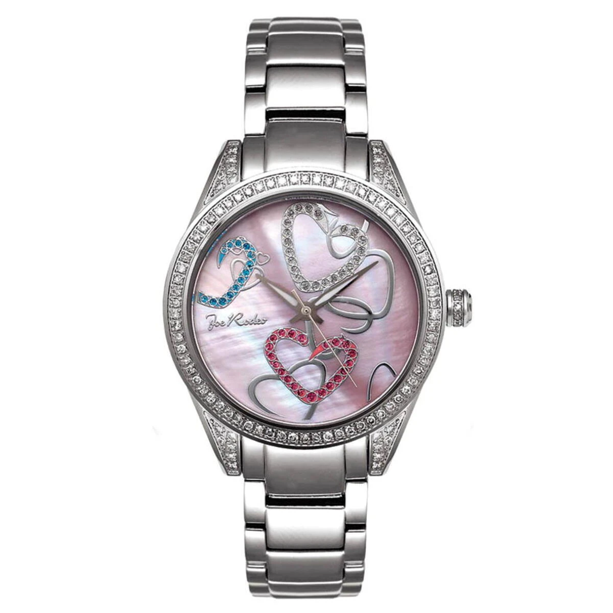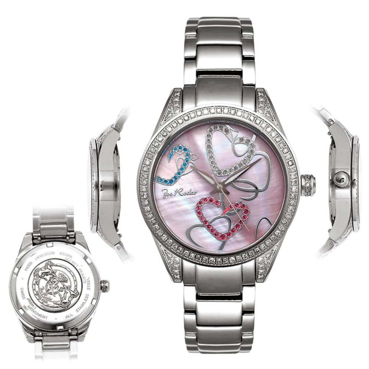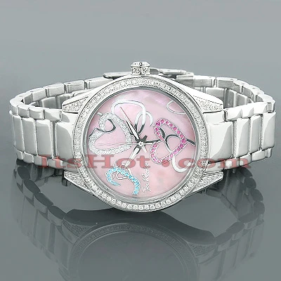 This Joe Rodeo Secret Heart Ladies Diamond Watch features 1.60 carats of genuine diamonds, a polished silver tone stainless steel case and pink Mother of Pearl dial paved in pink, white and blue stones. Clear diamonds sparkle on the bezel and lugs of this beautiful watch with an accurate quartz Swiss-made movement. This fabulous Joe Rodeo ladies diamond watch comes with two extra interchangeable bands in different colors. Water-resistant 100m (330 ft).
