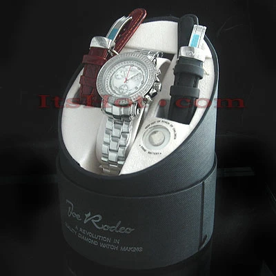 This exquisite Joe Rodeo women’s diamond watch features 1.25 carats of diamonds, round polished Silver stainless steel case, scratch-free crystal glass, individually numbered and engraved stainless steel case-back. Stainless steel band. White mother of pearl face. Fine Swiss-made quartz movement. Water-resistant to 100 m (300 ft). This luxurious JoJo watch by Joe Rodeo comes with two extra interchangeable bands in different colors. The patented strap adjusts once for a perfect fit, and comes on and off with the press of a button.