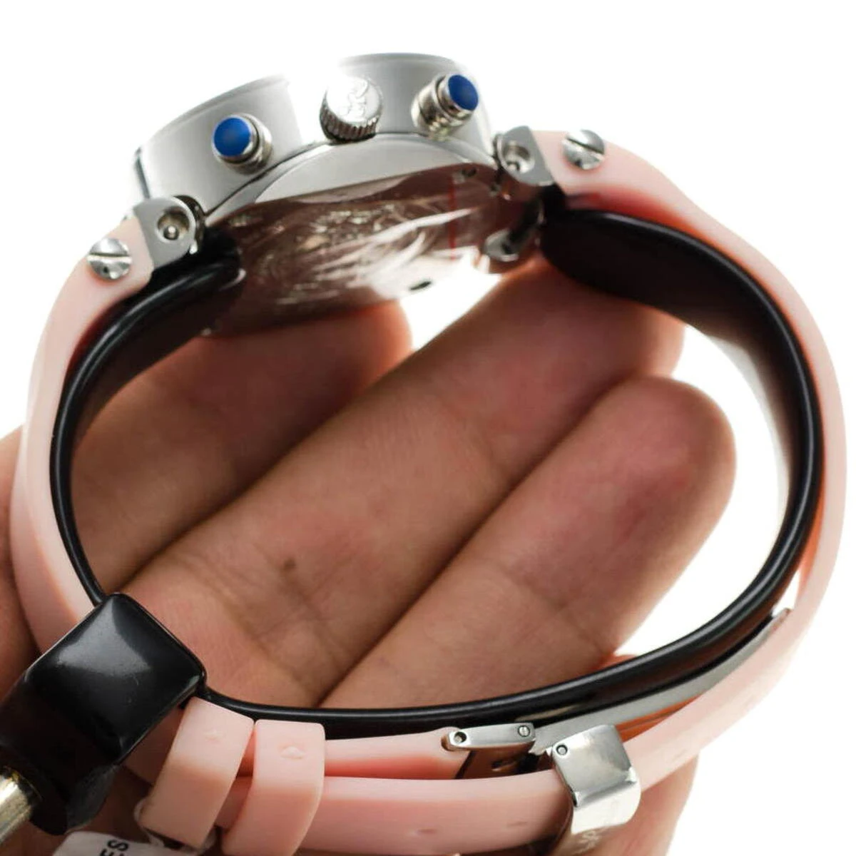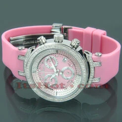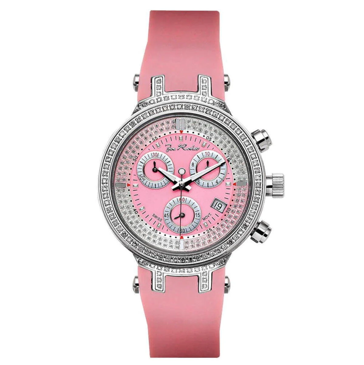 This Ladies Diamond Joe Rodeo Watch Pink Master features 0.90 carats of genuine diamonds on the bezel and lugs of the round polished silver stainless steel case and pink rubber strap that matches the dial. This women’s diamond watch from Joe Rodeo watches collection is equipped with a fine Swiss-made quartz chronograph movement with date indicator. Comes with two interchangeable rubber bands in different colors. The patented strap adjusts once for a perfect fit, and comes on and off with the press of a button.
