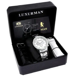 This Trendy Men’s Luxurman Diamond Watch features 0.2 carats of sparkling round diamonds. This Luxurman diamond watch showcases a silver tone dial with Date/Calendar/24 hours subdials and a silver tone stainless steel band. This men’s diamond watch by Luxurman comes with two extra interchangeable leather straps in different colors (band colors may vary). This Luxurman Diamond watch makes a perfect present for any occasion.