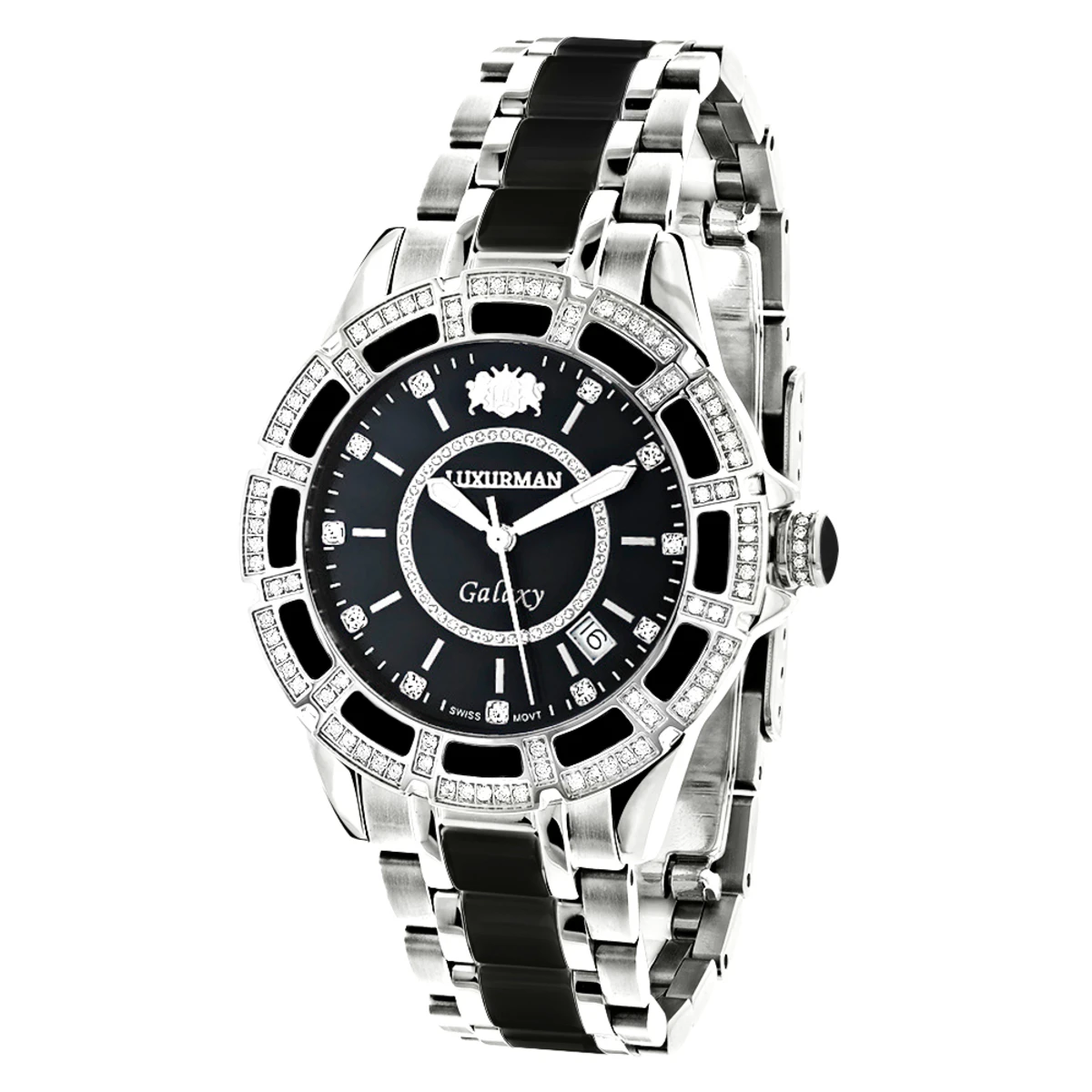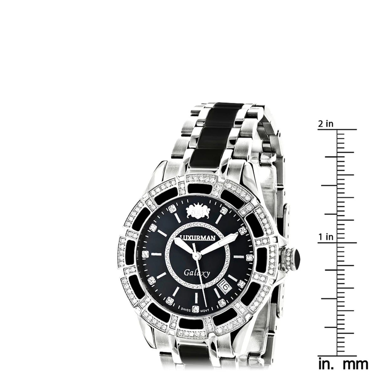 This Luxurman Galaxy Midsize Diamond Watch Black Ceramic showcases 1.25 carats of genuine diamonds. This unisex Luxurman watch is made with 18K white gold plated stainless steel and black ceramic, featuring a precise Swiss made movement, this sleek and quality made Galaxy watch comes with a 5 years manufacturers warranty! This stylish Luxurman watch is water resistant to 3 ATM and can be worn by both men an women.