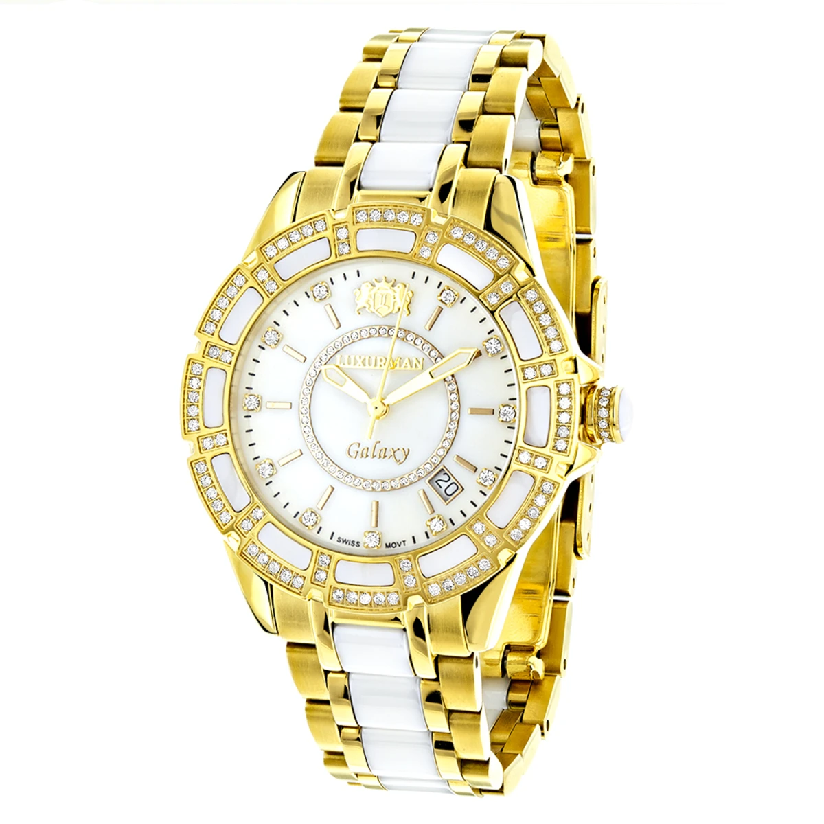 Luxurman Ladies Diamond White Ceramic Watch 1.25ct White MOP Galaxy Yellow Gold