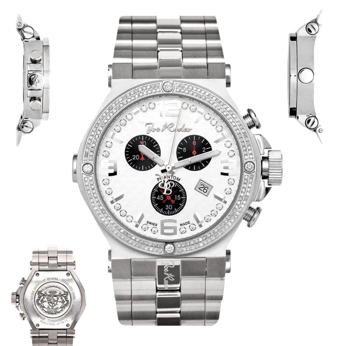 Luxurious Men’s Diamond Watches! This JoJo Joe Rodeo Phantom men’s diamond watch features 2.25 carats of diamonds, stainless steel case, scratch-free crystal glass and brushed stainless steel band. This watch has two rows of white sparkling diamonds around the bezel. The watch also features brushed Silver Stainless Steel dial with three black sub dials, Silver tone hour markers and a row of sparkling white stones around it. Super accurate Swiss-made quartz movement with chronograph function will keep the time for you. Water-resistant 100m (330 ft).