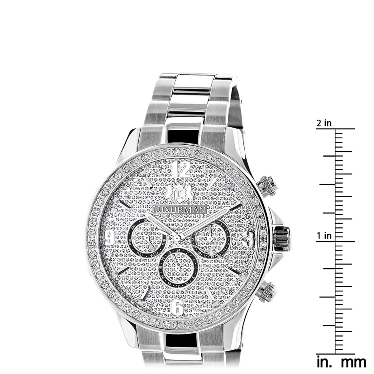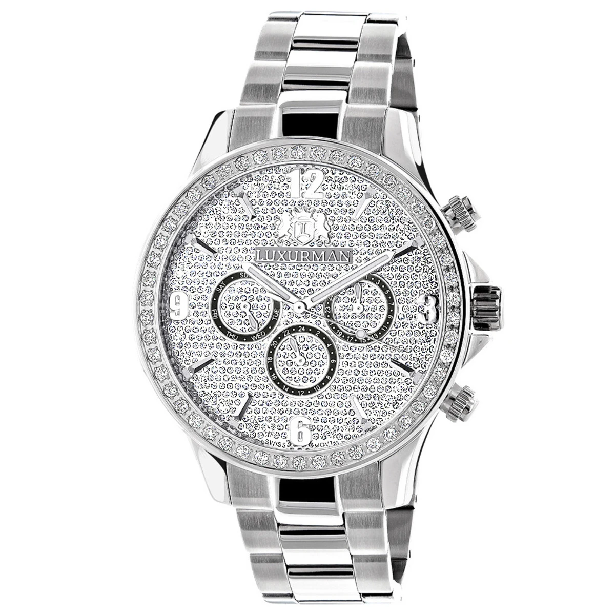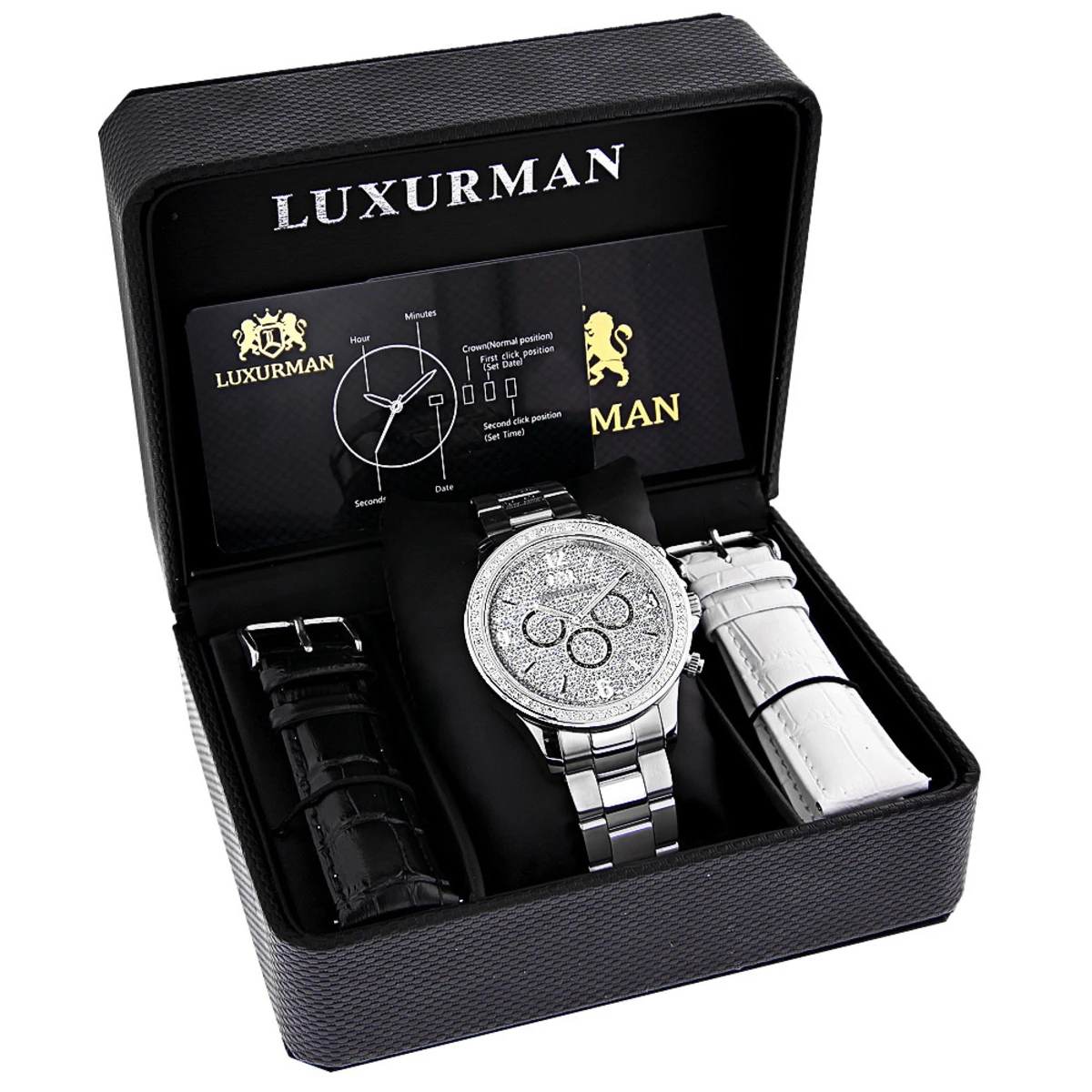 This Men’s Diamond Watch by Luxurman features 2 carats of sparkling diamonds. This Luxurman diamond watch showcases a fully paved dial with Date/Calendar/24 hours subdials, and a white gold plated stainless steel case and band. This men’s diamond watch by Luxurman comes with two extra interchangeable straps in different colors (colors may vary). This Luxurman Diamond watch makes a perfect gift for any occasion.