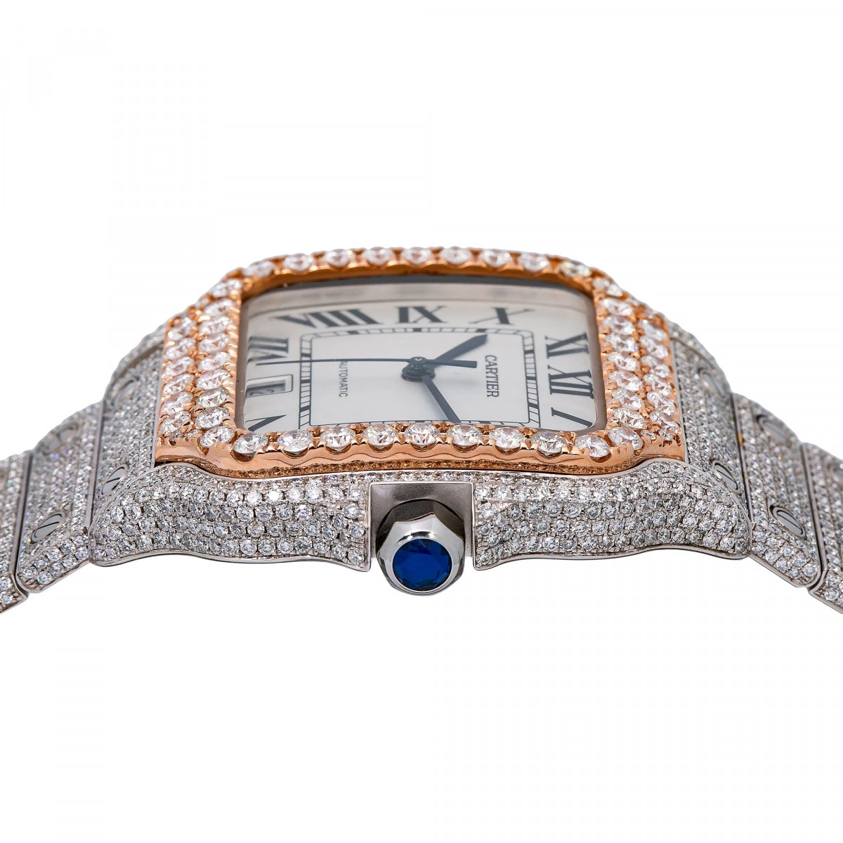 The Cartier Santos de Cartier Rose Gold 40mm White Dial Men’s Diamond Watch is a timeless classic that will never go out of style. This luxurious watch features a 40mm case diameter and width, crafted from 18K rose gold and set with 17.96 carats of white diamonds. The bezel is also crafted from 18K rose gold and is set with white diamonds, giving the watch a stunning sparkle. The white dial is protected by a scratch-resistant sapphire crystal and is powered by an automatic movement. This watch is water-resistant up to 100 meters and is engravable, making it a perfect gift for any special occasion. With its classic design and luxurious materials, the Cartier Santos de Cartier Rose Gold 40mm White Dial Men’s Diamond Watch is sure to become a treasured heirloom.