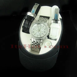 This luxurious men’s JoJo Joe Rodeo classic diamond watch features 2.50 carats of diamonds, a polished Silver stainless steel case, scratch-free crystal glass, individually numbered and engraved stainless steel case-back. This men’s diamond watch features diamonds on the bezel and on the lugs. Accurate Swiss-made quartz movement with chronograph function. Comes with two extra interchangeable bands in different colors. Water-resistant 100m (330 ft).