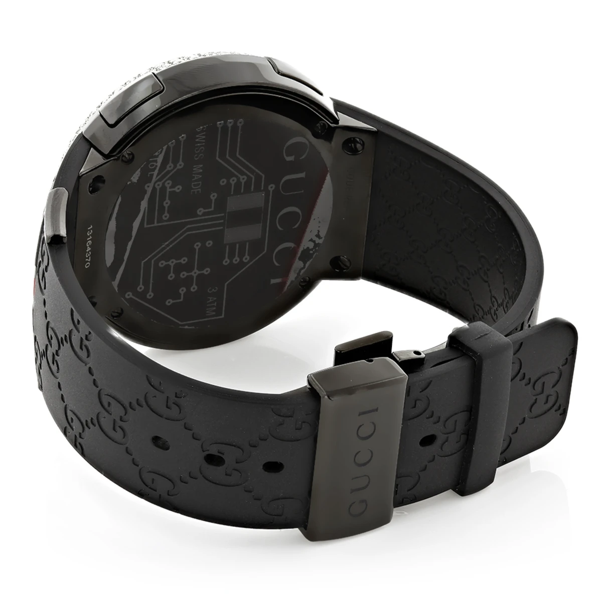 Genuine Gucci men’s luxury watch features 2.5 carats of sparkling white diamonds around the black stainless steel case, a scratch resistant sapphire crystal, a black rubber strap with green/red/green web and a digital dial code. This men’s Gucci diamond watch showcases a fine Swiss-made movement and is water-resistant to 30 m (100 ft).