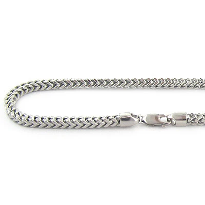 We are proud to present this exclusive men’s 10K solid white gold Franco chain necklace with a lobster claw lock. This solid gold FRANCO chain for men is a squared off chain and weaved together for a very rich look. It takes the top of the line craftsman to make this men’s gold chain, where each individual facet is welded in a perfect fit for excellent movement and flexibility. This Men’s gold Franco necklace will not kink and you can even roll it around your finger! It is a polished type chain, yet it catches the light with your every move and is extremely durable in the 10K gold. This chain is 4mm wide.