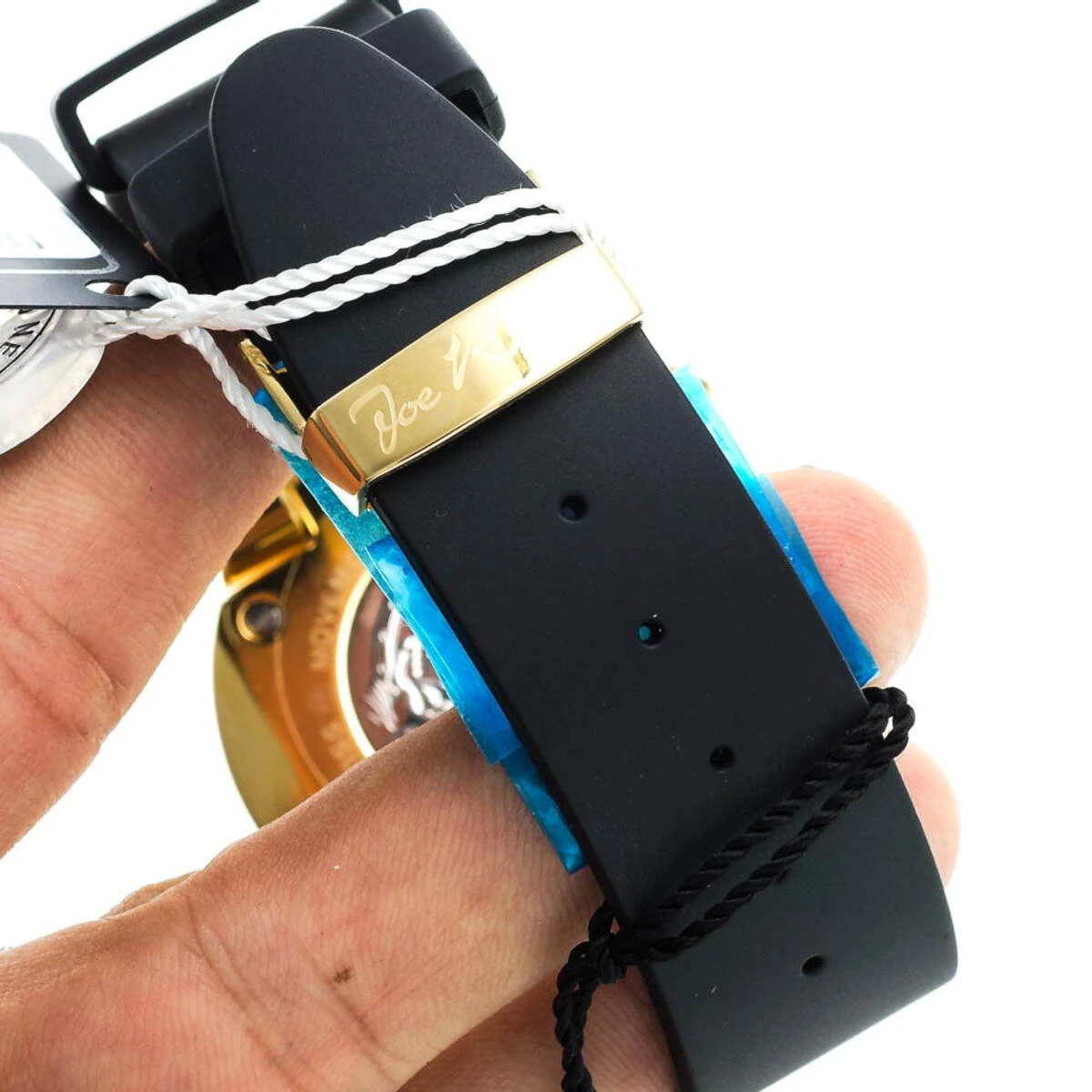 Unique Yellow Gold Tone Watches: This Joe Rodeo Men’s Diamond Watch features 2.20 carats of genuine diamonds, a yellow gold tone stainless steel case and a black rubber band. The watch showcases a dial with a yellow pinstripe design, white sparkling stones on hour and minute markers, three chronograph sub dials, and a date display window at the 4 o’clock position. This Joe Rodeo diamond watch is equipped with a very accurate Swiss-made quartz chronograph movement and comes with extra interchangeable watch bands in different colors.